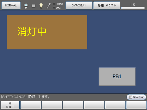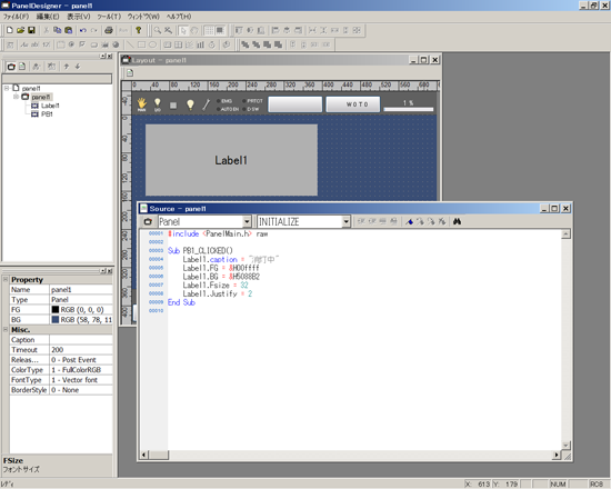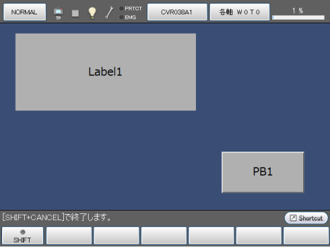ラベルは文字列を表示する部品で、イベントは発生しないため動作記述は行えません。ここではラベルを作成し、同一画面中のボタンが押されたときにそのラベルのパラメータを変更する例を示します。