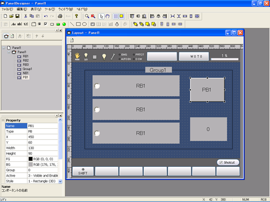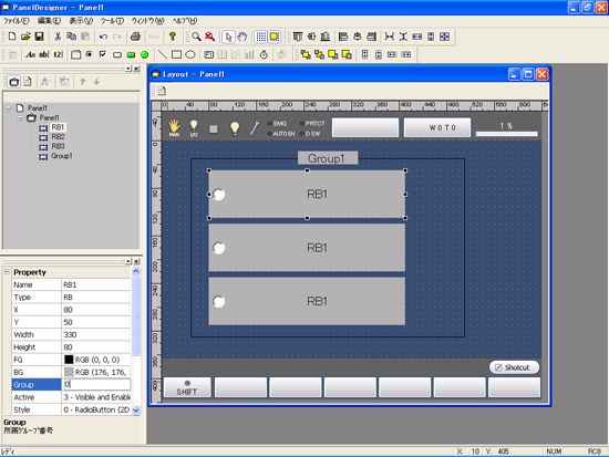 ラジオボタン3個で排他処理を行う例を示します。PanelDesignerでラジオボタン3個とグループ1個を配置します。