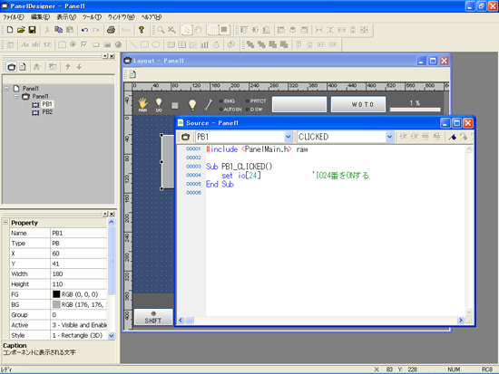 まず押されたときにIO24番をOnするプログラムを記述します。ソース編集画面上部のコンボボックスから部品名"PB1"、イベント"Clicked"(押されたとき)を選択すると、自動的にプログラムの外側が生成されます。