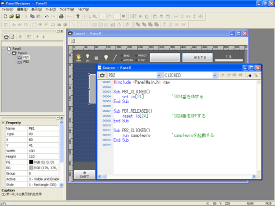 同様に離されたときにIO24番をOFFするプログラム(部品名"PB1"、イベント"Released":離されたとき)、押されたときにプログラム(samplepro)を起動するプログラム(部品名"PB2"、イベント"Clicked")を記述します。