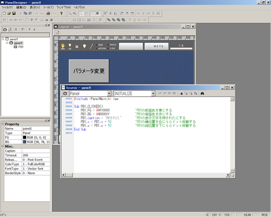 先ほどのようにPanelDesignerを起動し、プッシュボタンの配置とソース編集画面の立上げを行ってください。