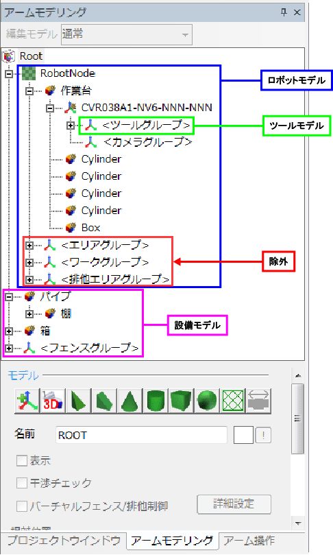 | ロボットモデル | Robot Node以下で、ツールグループ、エリアグループ、ワークグループ、排他グループ以下を除くオブジェクト。 | - |