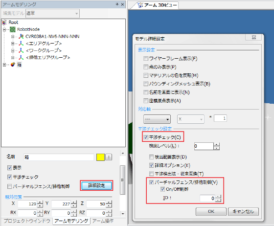 「詳細設定」から「モデル詳細設定」を開き、バーチャルフェンスを有効にします。