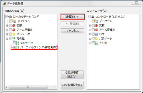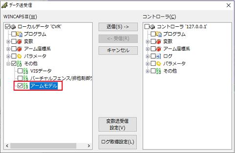 通信設定の方法については、WINCAPSIIIガイドの「COBOTTAとの通信」を参照してください。 - 「アームモデル」にチェックを入れると、バーチャルフェンス/排他制御データの作成基のモデルデータをCOBOTTAに送信できます。ただし、COBOTTA内に保存領域が不足している場合は、アームモデルの項目は表示されません。
