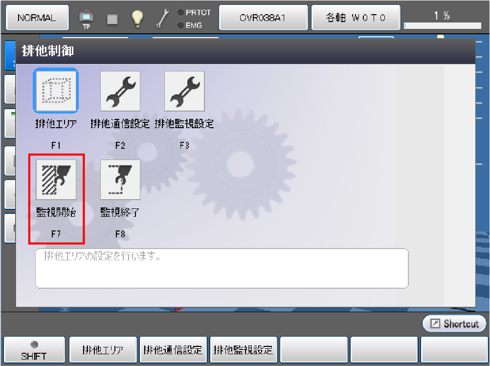 監視が無効であっても、ロボットの状態が待機状態であると、一定時間後に待機タイムアウトでエラーが発生します。この場合は、排他エリアに侵入しているロボットを手動操作で退避させた後に、リモートTP/バーチャルTPの排他制御画面にて、[F7 監視開始]を押して監視を有効にしてください。排他エリアにロボットが侵入している情報をクリアできます。