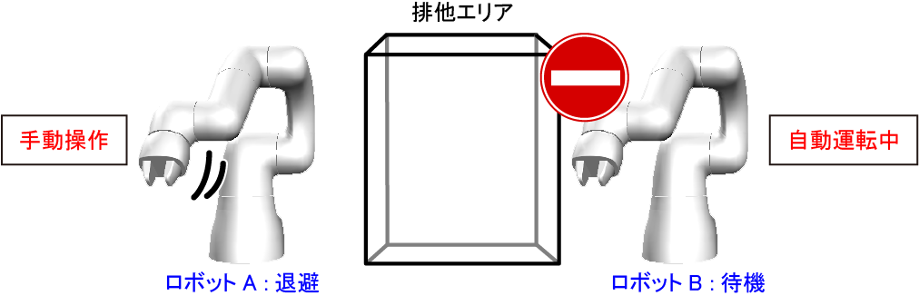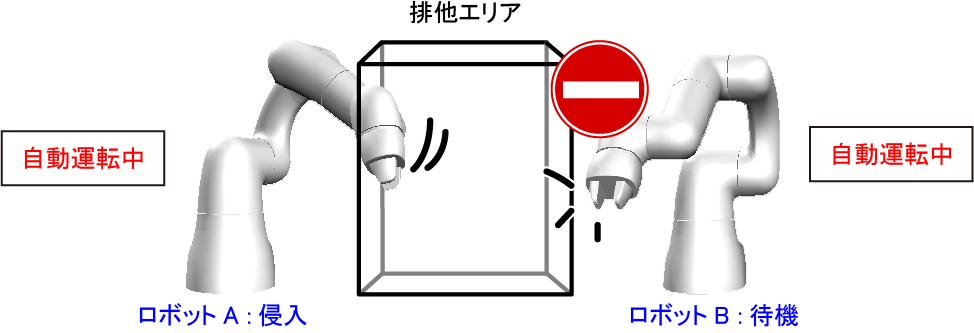 排他制御機能では、ロボットが侵入しようとしている排他エリアに対し、すでに他のロボットが侵入しているときは、減速または停止することで排他エリアへの複数ロボットの侵入を禁止します。