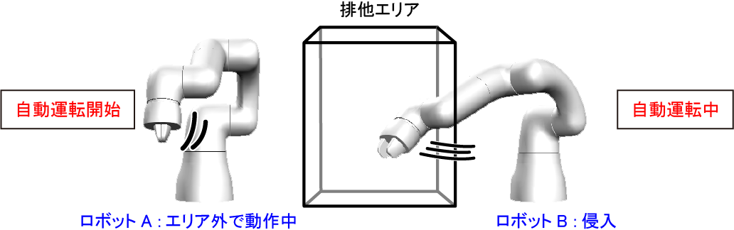 - 排他エリアとロボットの動作開始位置が近すぎたり、動作スピードが速すぎる場合、監視のタイミングが合わず、排他エリア内に侵入してエラーで停止することがあります。