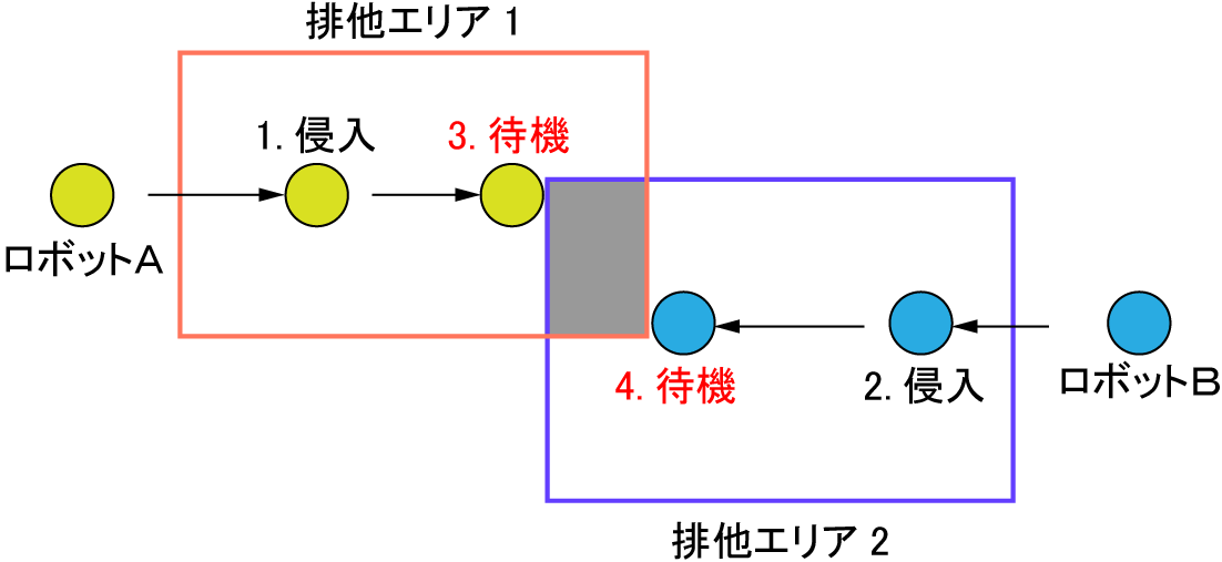- ロボットAが排他エリア2に侵入しようとするが、ロボットBが入っているため、ロボットAは待機する。