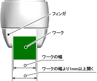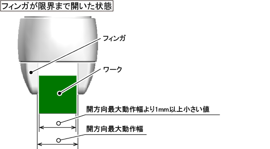 ワークの幅(フィンガでつかむ部分の幅)は、上記の開方向最大動作幅より1mm以上小さい値である必要があります。