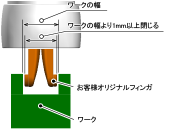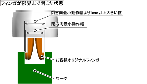 ワークの幅(フィンガでつかむ部分の幅)は、上記の閉方向最小動作幅より1mm以上大きい値である必要があります。