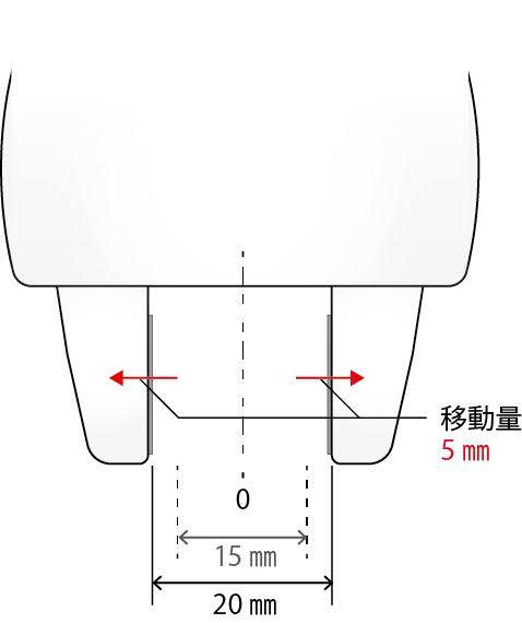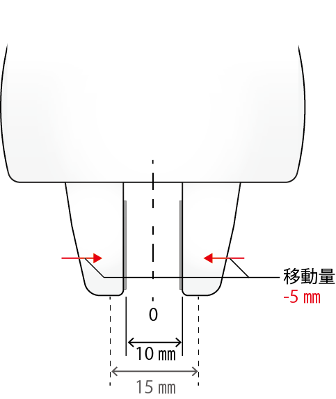 例えば、フィンガ間の距離が15mmの位置にあるときに、5mm相対移動させると、全体として20mm開いた状態になるので、右フィンガは10mmの位置に、左フィンガは反対方向に10mmの位置に移動します。