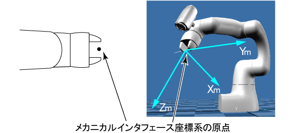 COBOTTA用電動グリッパが装着されている場合は、メカニカルインタフェース座標系は、フィンガの先端かつ、両フィンガの中心になります。