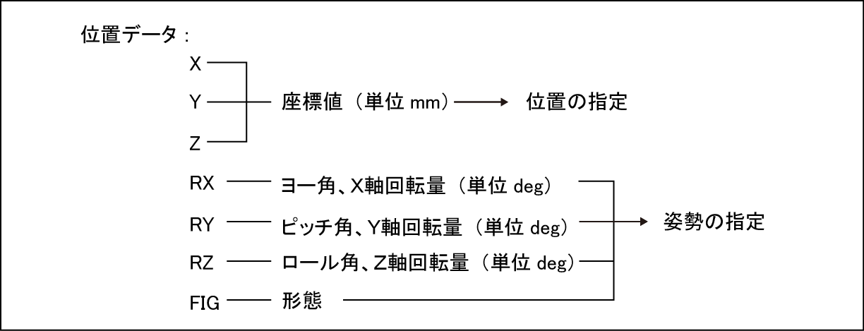 位置データとは、ロボットのフランジ中心(ツール定義が有効なときはツール先端)の位置と、そのときのロボットの姿勢を表す7要素のベース座標系(ワーク座標系が有効なときはワーク座標系)のデータをいいます。