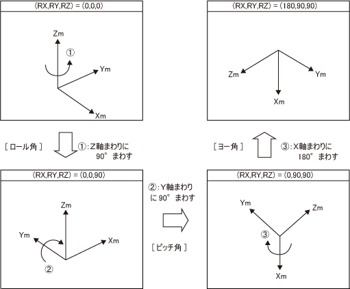 姿勢: (RX, RY, RZ) = (0, 0, 0) → (RX, RY, RZ) = (180, 90, 90)