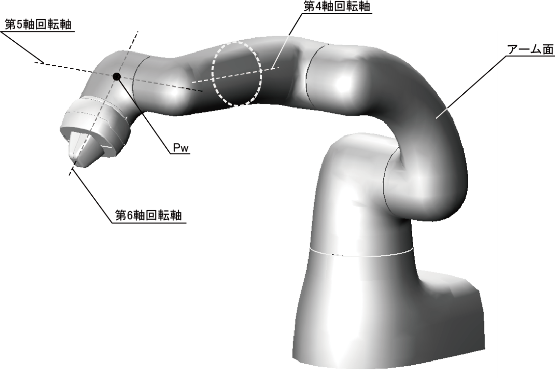 腕・ひじ・手首の境界の判定は、第5軸の回転軸と第6軸の回転軸が交わる点「Pw」の位置を使って行います。