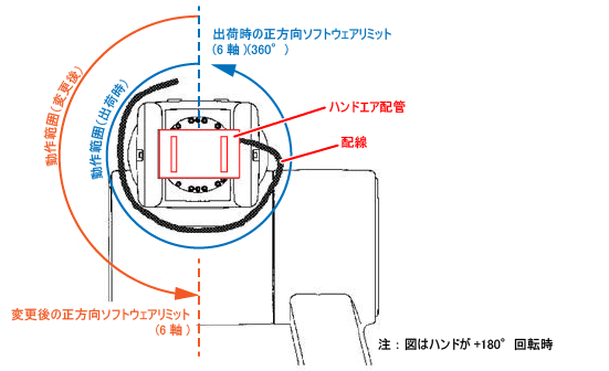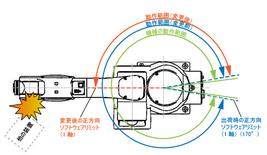 ロボットが他の装置と干渉する場合、下図に示すように、ソフトウェアリミットを変更して、動作範囲を狭くしてください。 また、ハンド用エア配管、および配線がロボットの動作によって引っ張られる場合にも、下図のようにソフトウェアリミットを変更して、動作範囲を狭くしてください。