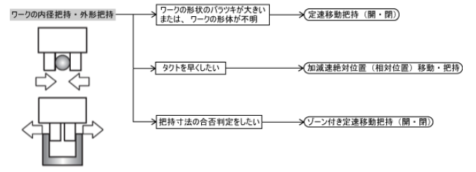 さらに、チャック動作では、最初は高速でフィンガを移動し、ワーク近くになると低速になる設定ができるモードや、ワークの把持が一定の範囲内で検出できたかを判定する機能付きのモードもあります。