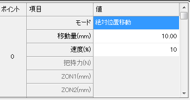 - 絶対位置移動あるいは相対位置移動の動作でワークを把持した場合、過電流や位置偏差過大、モータ過負荷のエラーが出る可能性があります。ワークを把持する場合は把持動作のコマンドを使用し、絶対位置移動あるいは相対位置移動の動作はワークを離す場合もしくは爪を移動させる場合に使用してください。