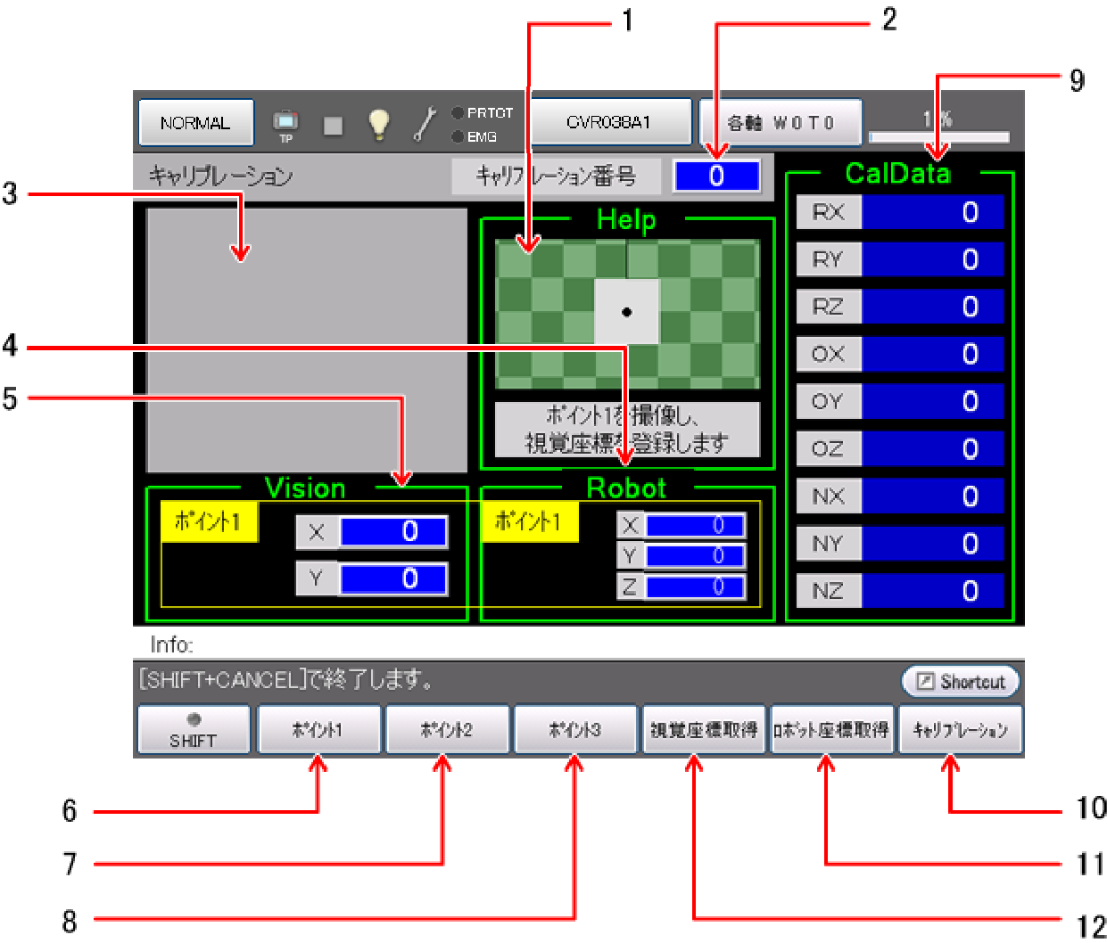 | 2 | ポイント1~3の各登録された視覚座標を確認できます。 |