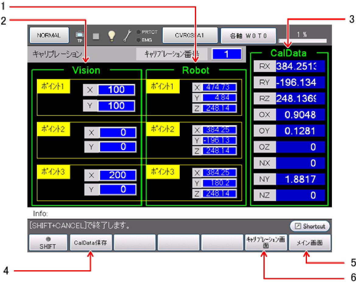 | 1 | ポイント1~3の登録されたロボット座標を確認できます。 |