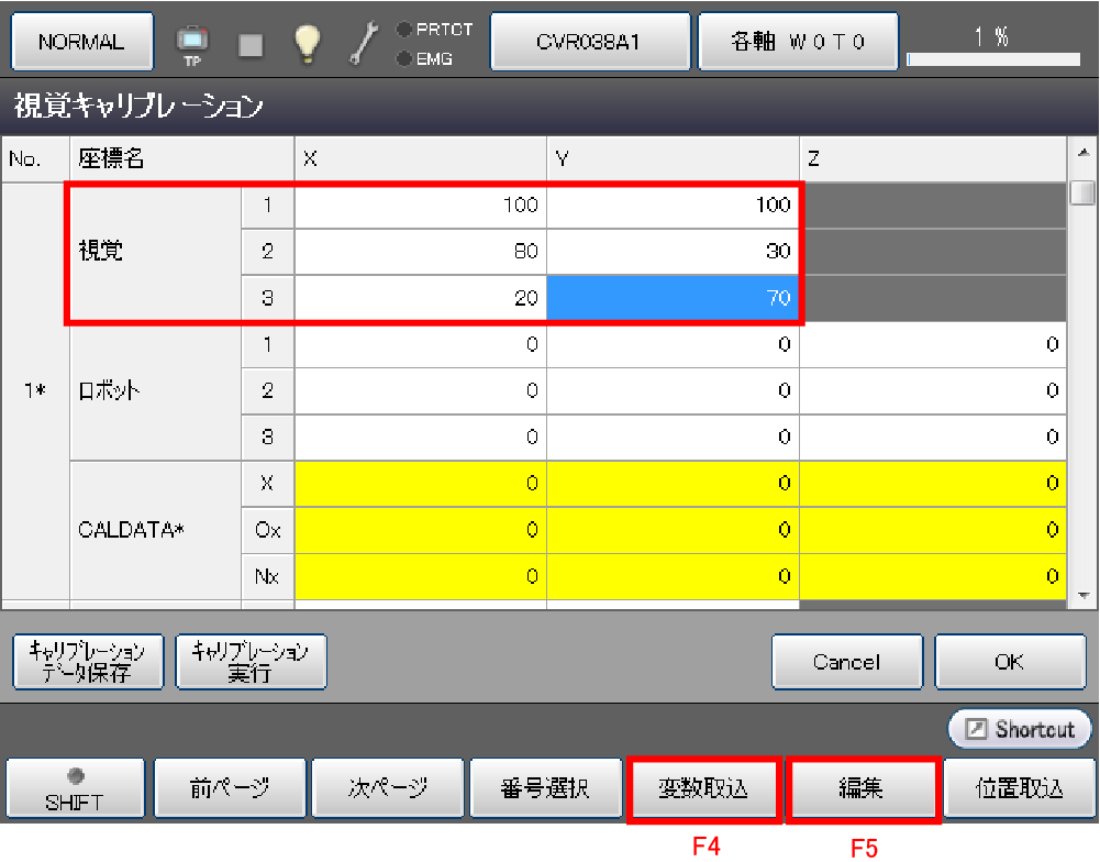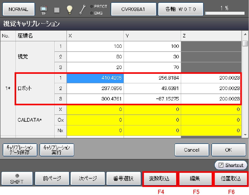 上記Step1、Step2を実施後、「CALDATA」の該当項目を選択し、[F5 編集]ボタンを押します。