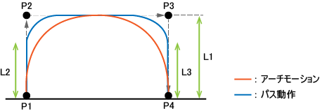 また、P4に対するZ軸の動作量(L1)、パスの開始位置(P1からの距離L2)、パスの完了位置(P4からの距離L3)を指定するだけですので、プログラム作成も簡単です。
