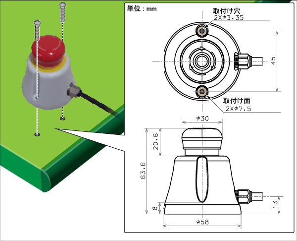 非常停止ボックスには、固定するためのねじ穴があります。固定する場合は、下図の寸法図を参考にしてください。