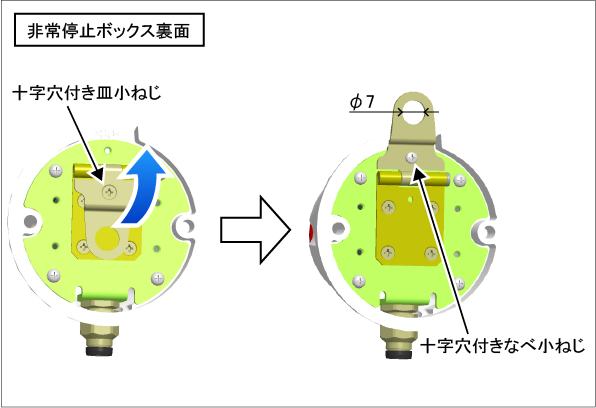 また、フックなどにひっかけて使用することもできます。ひっかけて使用する場合は、非常停止ボックス裏面の十字穴付き皿小ねじをはずし、下図のようにヒンジを開いて十字穴付きなべ小ねじで固定してください。