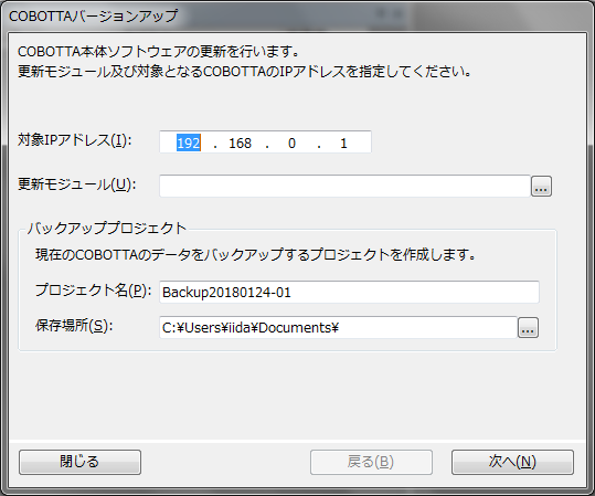 現在COBOTTAで使用されているデータをパソコンにバックアップします。 - 更新モジュール送信