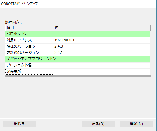 | バックアッププロジェクト | 現在のCOBOTTA内部のデータをPC上にバックアップします。 プロジェクト名とPC上の保存場所を指定します。 |