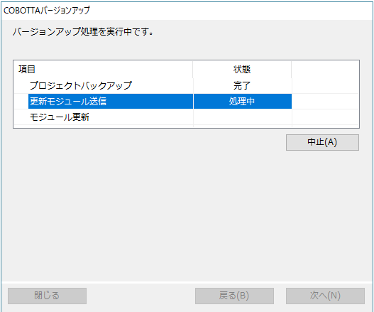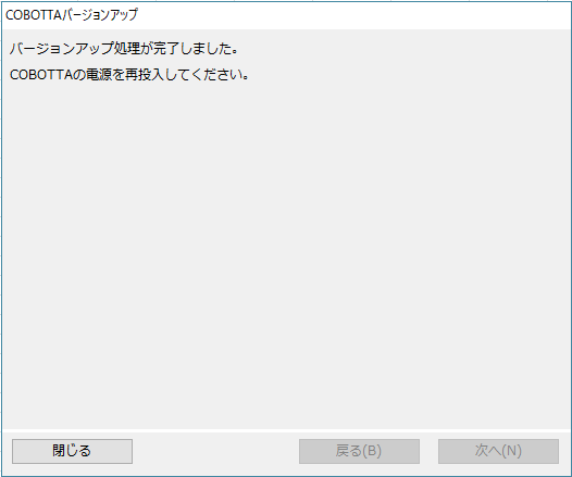 バージョンアップ中は指示があるまで絶対にCOBOTTAの電源を切ったり、通信ケーブルを切断したりしないでください。