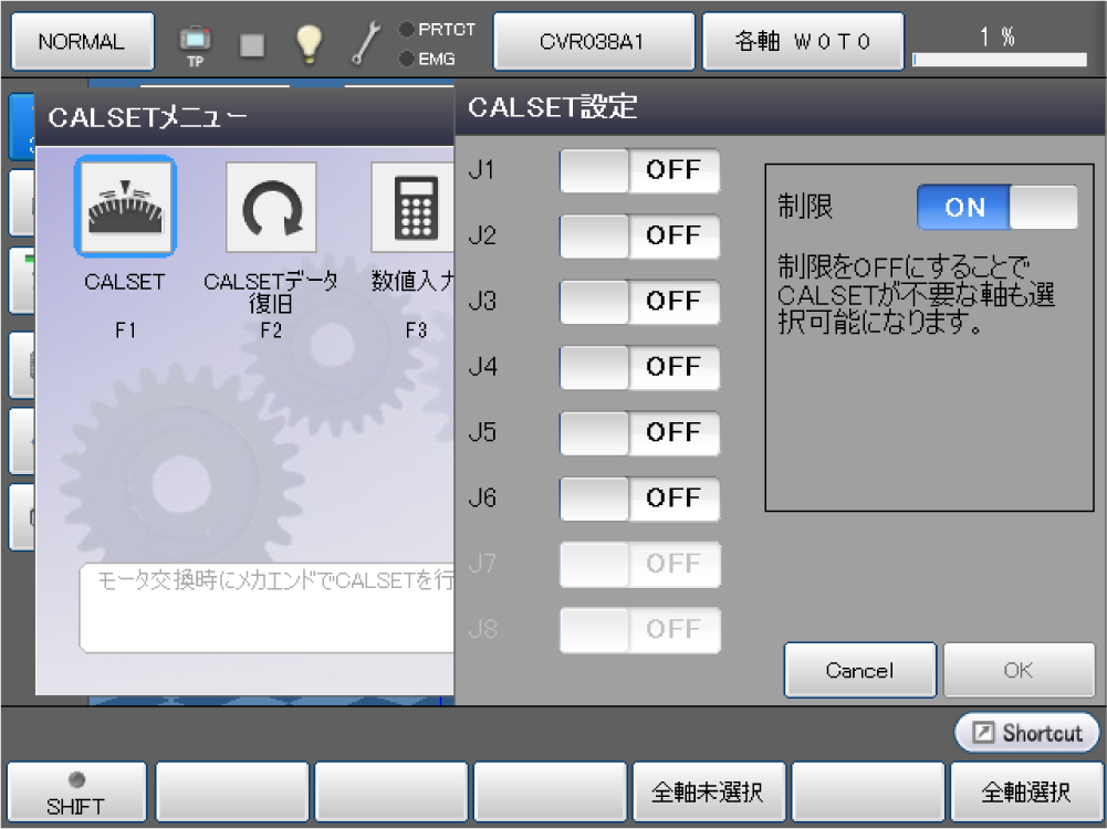 | 制限 | 制限をOFFにすることでCALSETが不要な軸も選択可能になります。 |