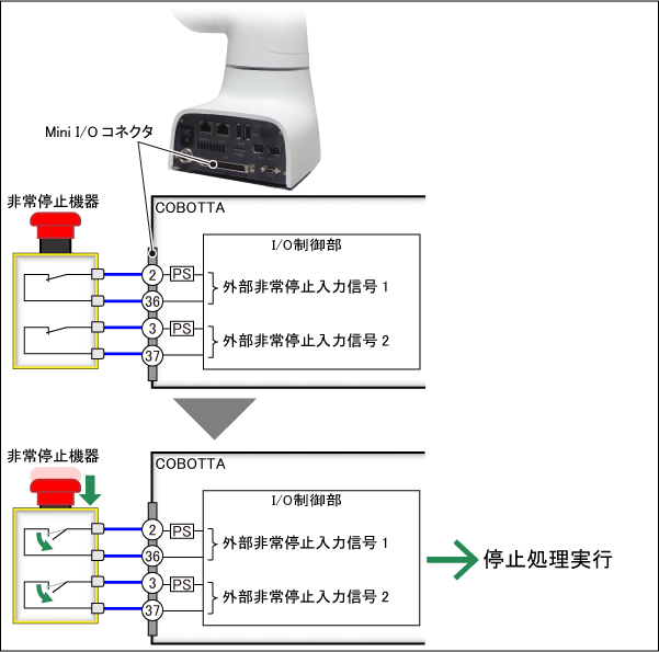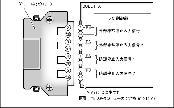 上図のMini I/Oコネクタに記載している番号は、端子番号です。外部非常停止入力は2系統あり、2番端子と36番端子で1系統目、3番端子と37番端子で2系統目を構成しています。