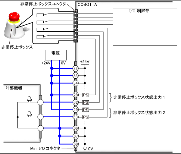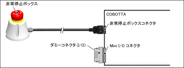 非常停止ボックス状態出力は、COBOTTAの内部回路を介さず、直接Mini I/Oのコネクタにつながっています。そのため、COBOTTAの電源が入っていなくても、外部機器は非常停止ボックスの状態を知ることができます。