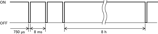 750 µsの長さのOFF状態を、8 ms間隔で3回行ったあと、8時間後に再び同じ波形を出力します。