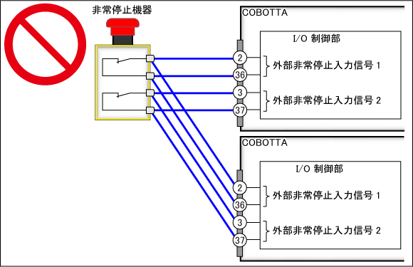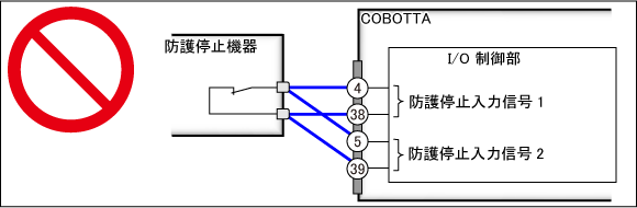 下記のように、非常停止機器および、防護停止機器の各接点に、複数の信号を接続すると、COBOTTAが故障する可能性があります。絶対に行わないでください。