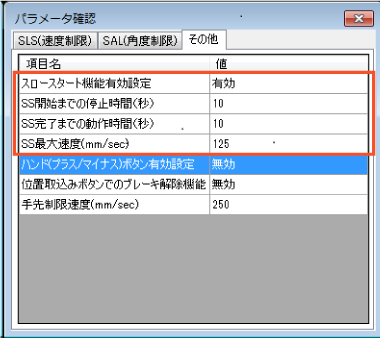 | SS開始までの停止時間(秒) | 10 | スロースタート機能有効時、設定された時間以上ロボットが停止している場合にロボットが低速で動作します。 ただし次の場合は設定時間に関係なくスロースタート機能が働きます。