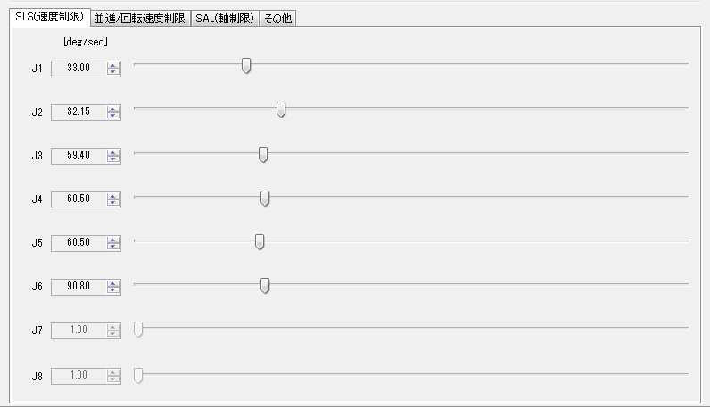 | J1~J8 | 各軸の速度制限の制限値。SLS速度制限タブで編集できます。 |