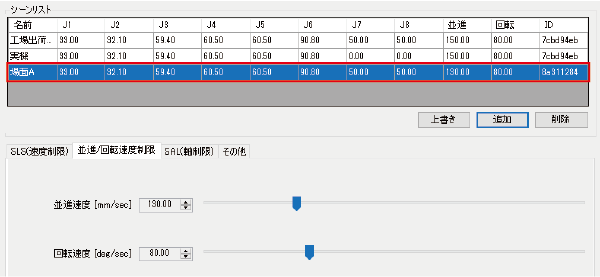 この場合、場面Aの安全パラメータを、シーンリストに追加しておきます。(並進速度を130.00mm/secに設定して"場面A"という名前で追加します。)