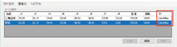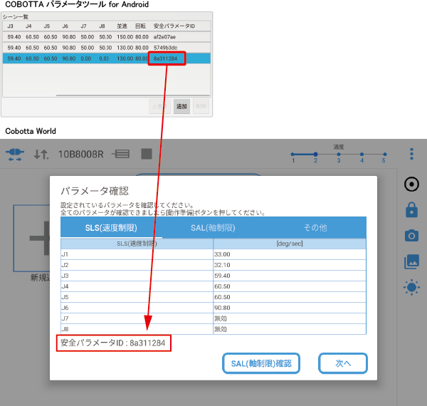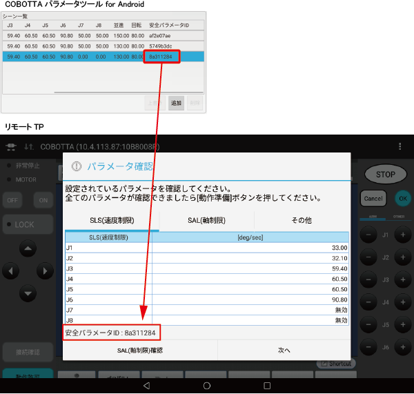 安全パラメータIDが同じ場合、選択したシーンリストの安全パラメータが正しくCOBOTTAに格納されています。