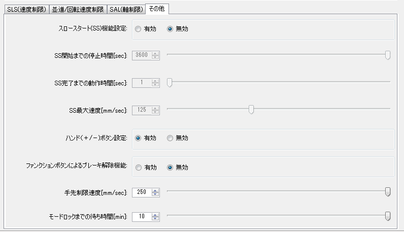| SS完了までの動作時間 | 10 [sec] | スロースタートした後、指定の速度に戻るまでの動作時間を設定します。 |