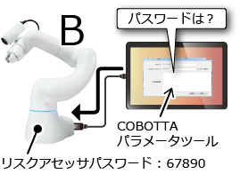 右の図の場合、COBOTTA "B"にはリスクアセッサパスワードに "67890" が設定されているので、COBOTTAパラメータツールからデータを送信する際は"67890" を入力します。 |