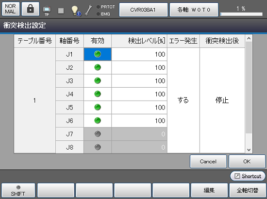 | 有効 | 軸ごとに衝突検出機能の有効/無効を設定します。 [編集]ボタンを押すと、状態を切り替えるか確認メッセージが表示されます。 [OK]を押すと、値が変更されます。 詳細については、機能ガイドの、衝突検出機能の "有効/無効の設定" を参照してください。 |