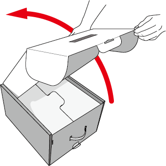 上蓋は上図の位置まで開けてください。必要以上に開けると、梱包物が出てしまう恐れがあります。