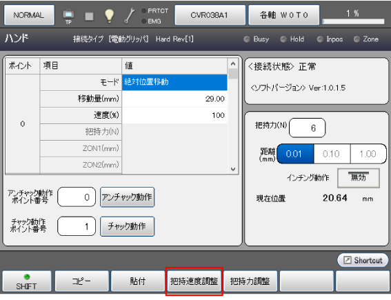 ハンド画面の[F9 把持速度調整]ボタンを押します。