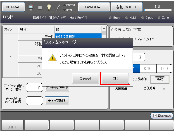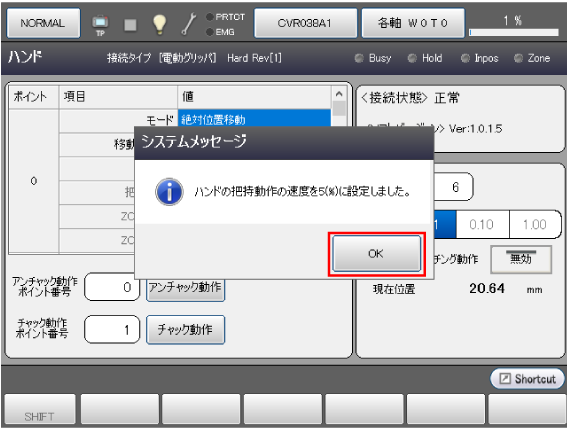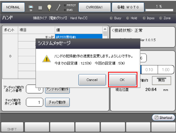 把持動作速度の入力画面が表示されますので、把持動作速度(%)を入力します。入力後、[OK]を押します。