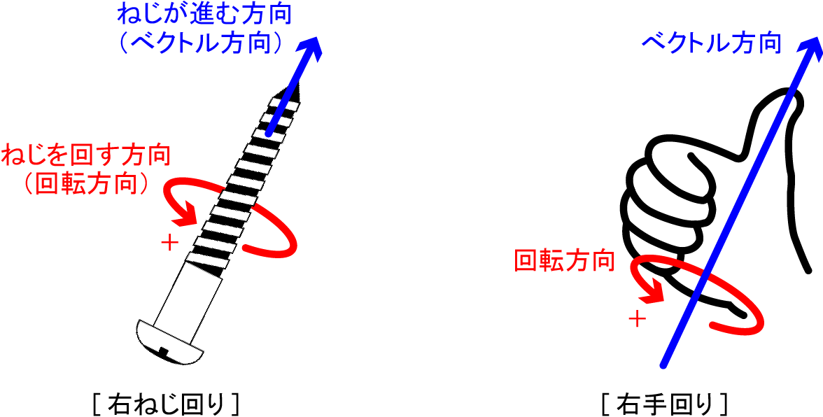 「右ねじ回り」とは、板にねじを差す場合、右回りに回すとねじが進んでいく原理をもとにしています。ここでは、ねじを差す方向がベクトル方向で、ねじを右回りに回す方向が回転方向になります。