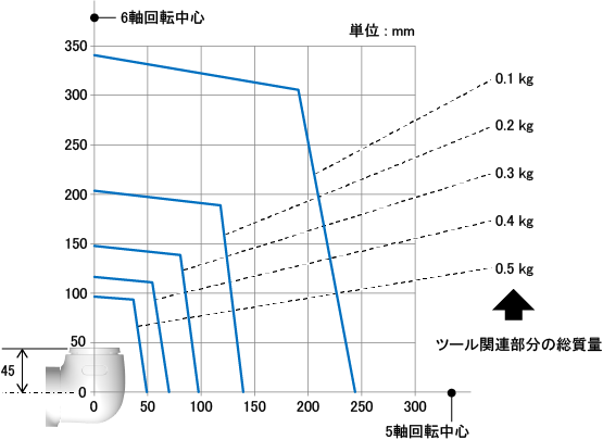 下図は、6軸回転中心と5軸回転中心の交点から、ツール関連部分の重心位置までの距離の許容範囲を、ツール関連部分の総質量別に示した図です。