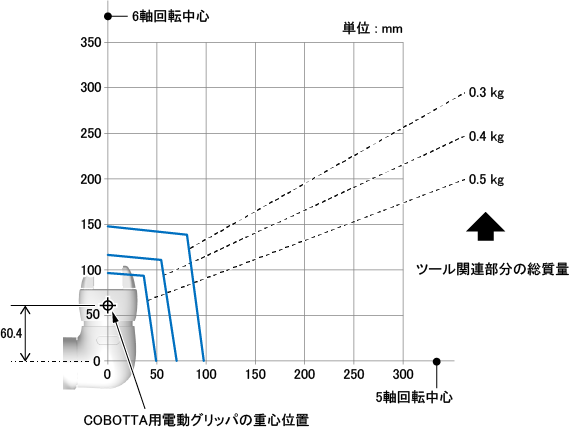 なお、ツール関連部分の総質量を計算する際には、COBOTTA用電動グリッパの質量(0.2 kg)を足してください。