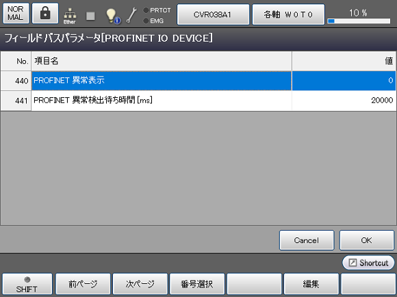 COBOTTAが起動し、PROFINET通信の通信状態チェックが始まるまでの時間が短いと、起動直後にエラー[8350200B : フィールドネットワーク通信準備中です]が発生することがあります。 この場合には、異常検出待ち時間(ms)を長くして調整します。